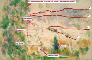 Cette photo aérienne permet d’imaginer que Cezanne se tenait sur ce qui s’appelle aujourd’hui Route de Valcros, dans sa partie bordant les stades et allant vers le golf (l’autre partie de la Route de Valcros – coïncidant avec l’ancien chemin de Valcros – va vers la Constance et Bellevue). Une incertitude demeure quant à l’alignement exact entre la tour de Lou Deven et le clocheton de Barberoux : en l’absence de photo de cette bastide, on peut hésiter sur l’emplacement exact de ce clocheton, d’où les deux axes extrêmes tracés en fonction des excroissances que l’on discerne sur le toit. La différence n’est pas bien grande, puisqu’elle se réduit à l’espace entre deux arbres environ en ce qui concerne la position du peintre.