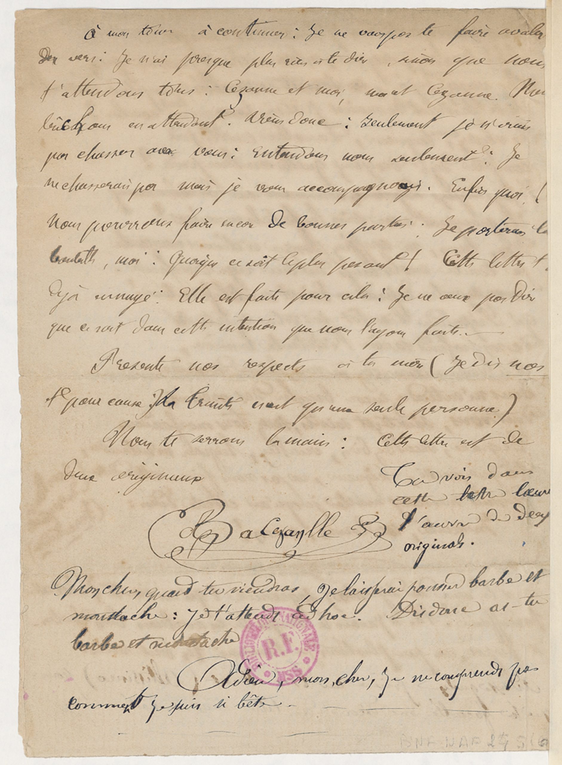 – il aurait pu lui en communiquer le contenu seulement, mais on ne voit pas pourquoi (sauf dans l’hypothèse formulée par Alain Pagès, d’un signe en direction de Zola), et en outre dans ce cas cette lettre serait restée avec les autres et on l’aurait retrouvée dans le paquet quand Cézanne l’a confié à Alexandrine. Or elle n’y était plus. Peut-être en a-t-elle été extraite pour la recopier et ensuite on a omis de la remettre à sa place et elle s’est perdue ?