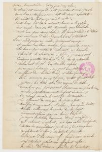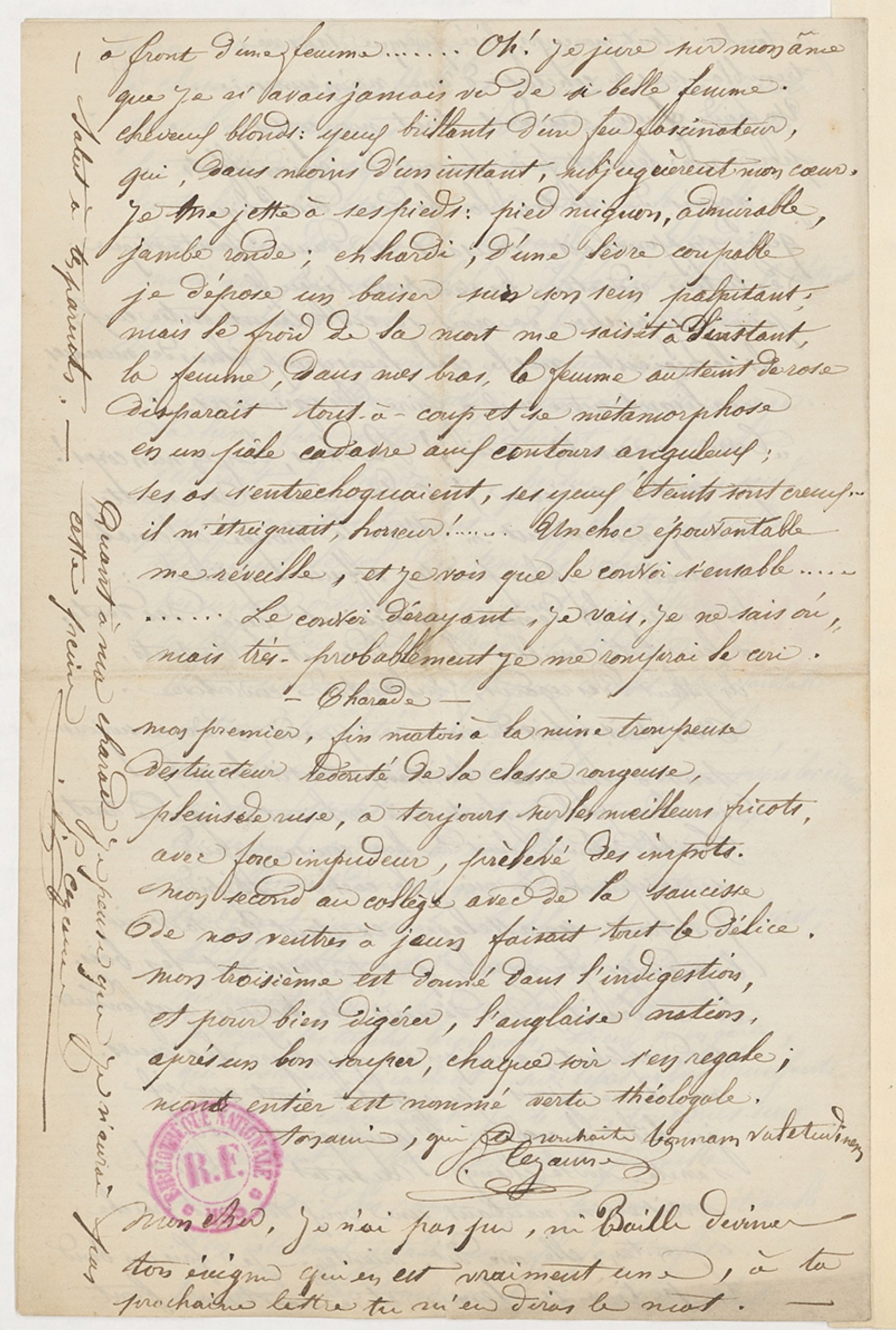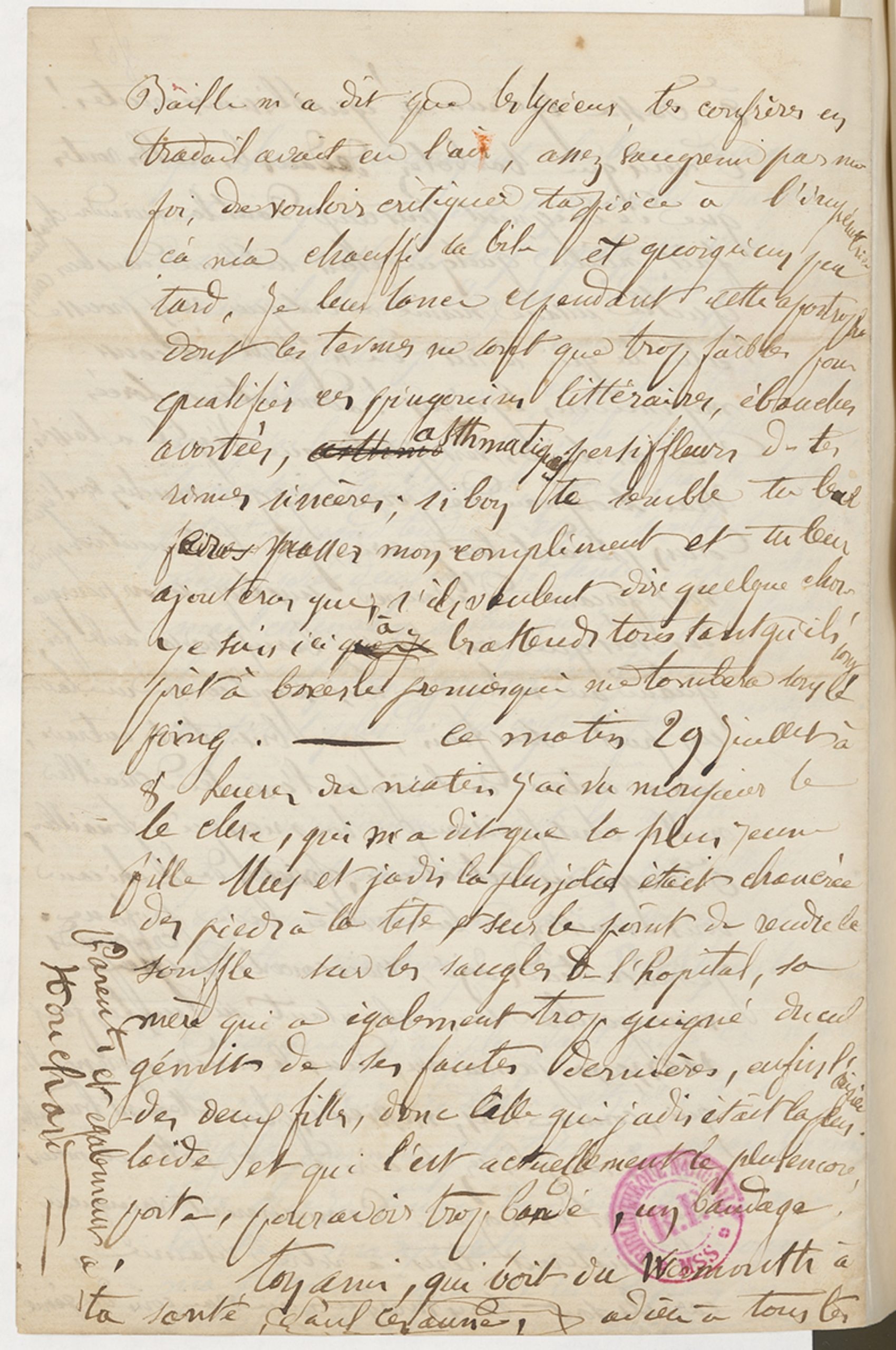 Je ne vois personne et les soirées me paraissent bien longues. Je fume beaucoup, je lis beaucoup et j’écris fort peu. J’ai cependant achevé « Les Grisettes de Provence » [texte perdu, ou repris en mars1865 ?] ; j’ai ressenti comme un certain plaisir en racontant ces folies. Mais je suis loin d’être content de mon œuvre : la matière était excessivement pénible ; les événements couraient les uns après les autres, il n’y avait pas de nœud, pas de dénouement. De plus, cela manquait de dignité et de moralité ; nos rôles étaient aussi bien loin d’être des rôles de héros de roman. Je me suis donc contenté de dire les faits tels qu’ils se sont passés, faisant le plus court possible, retranchant certains détails inutiles et n’altérant pas la vérité, que pour les événements tout à fait insignifiants. J’ai composé ainsi une espèce de nouvelle d’un intérêt médiocre pour les indifférents ; tu comprends qu’il ne sera pas facile de placer cela, mais cependant je ne désespère pas. Je vais m’en occuper et, dès que cela paraîtra, je t’en préviendrai.
