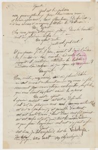 Cezanne écrit à Zola. En tête de la lettre, il dessine une scène où apparaissent, selon les dialogues écrits en dessous, les personnages de Dante et Virgile, inspirés par L’Enfer de Dante Alighieri.