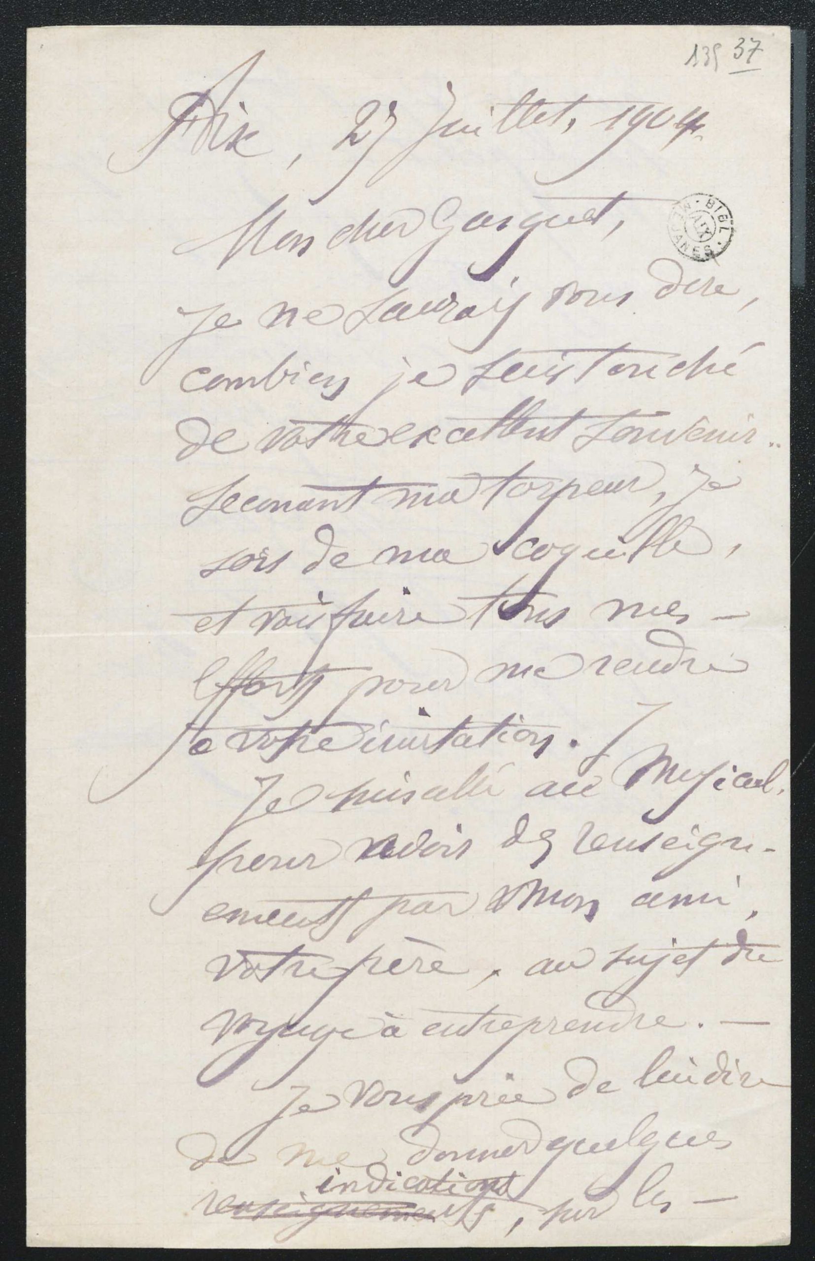 J’ai reçu votre bon souvenir, et je vous en remercie. Si je peux au printemps monter à Paris, j’irai vous souhaiter la main.