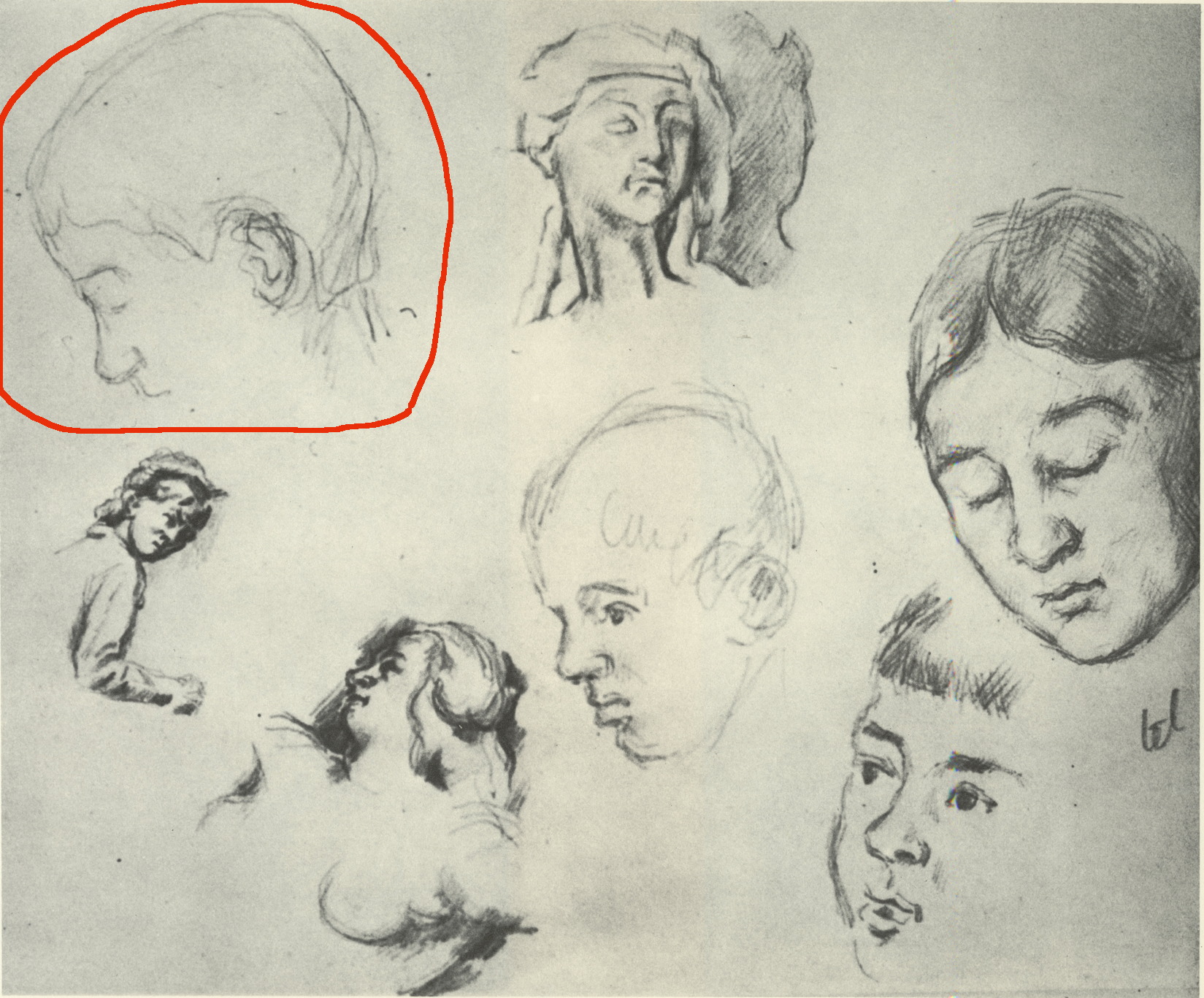 1873-75 Page d’études-têtes d’enfant, têtes de femme, cuillère et horloge C0692g-1.jpg |
