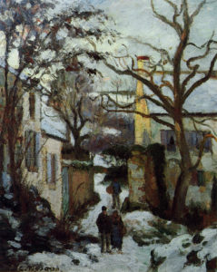 La version de Pissarro prit comme sujet l’ensemble de la scène, fuyant doucement : le chemin, le reste d’un mur de pierre, l’arbre, les maisons des deux côtés. C’était une progression ordonnée autour d’une courbe douce en S, une promenade lente, comme celle des personnages, nous laissant par-dessus tout une sensation de lumière et de saison : la fin d’un jour d’hiver, avec une pointe de lumière orange pour souligner le bleu qui s’assombrit.