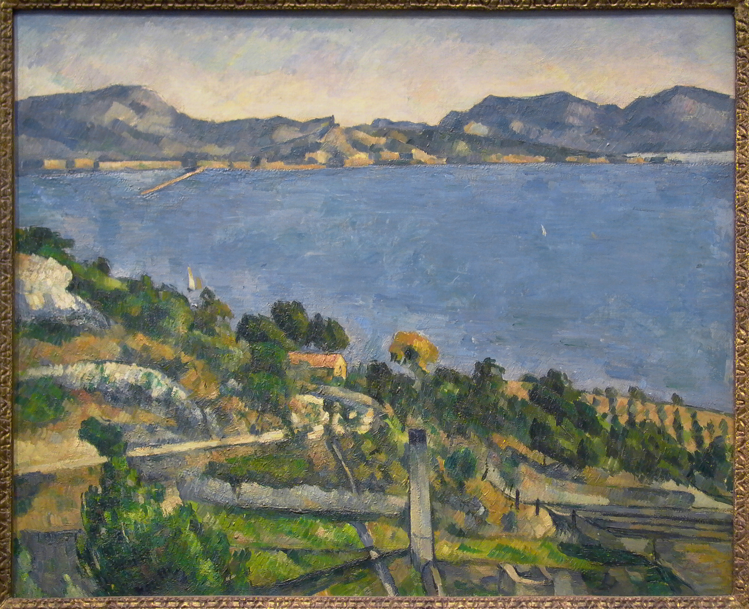 Thanks to the recent research done in l’Estaque,[1] we know a number of new sites that Cezanne painted there in the late 1870s and again in the early 1880s, almost all of which are based on one form or another of the parallel touch. Is it the various forms of the touch that fascinate, rather than their developmental sequence (which in any case remains elusive); they compel us to think about the paintings themselves, and the role of the site in their realization. Le Golfe de Marseille vu de l’Estaque, for example, might have been painted during the first period or early during the second (but probably not later); we cannot be sure. The picture is a crowded, bustling painting of what was even then a rather congested hillside and is now an overcrowded port as well. The parallel touch itself is quite small, densely set down, and built up of repeated layers of paint, not just in the hillside but, surprisingly, in the outline of the distant shore as well. In the near distance, it details roads, buildings, railway tracks and trees; it is curiously abstract in its patient, uniform touch and concrete in its references. It would be tempting to think that the touch suggests not the particular details but the busy disorder itself, but that would explain only the hillside, not the careful outlines of the distant shore. Possibly we are seeing a less than self-assured handling of the paint, one in which the painter cannot decide, thanks to the untidy subject, how best to juxtapose the touches.