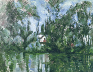 Au travail dans le nord sur les bords de la Marne aux environs de Paris, Cezanne peint trois tableaux très conservateurs, conservateurs dans le sens où ils prennent bien soin de rendre les tonalités noir vert de la lumière froide de la région et de la végétation dense, humide. Chacun d’eux fait contraster une maison blanche bordée de rouge avec un feuillage vert foncé – un choix qui est parfaitement justifiable, mais aussi traditionnel, ne reflétant que trop bien la tranquillité du site. Nous ne voyons nulle part la gamme de couleur élargie ou les couleurs de chaque objet divisées, ni ne sentons une atmosphère exaltée par la vue d’un coteau familier du sud. Dans Bords de la Marne (R623 FWN249), pourtant, les touches, bien que conservatrices, sont obliques et mouvementées là où elles décrivent les arbres, verticales et horizontales pour décrire le fleuve paisible; elles reflètent le coin auguste et représentent la perception du peintre de ce site particulier à ce moment. Ce n’est pas sa perception unique. Nous verrons que ses séjours dans le nord ont fini par libérer un flot de pensées analytiques, par exemple dans Au bord de l’eau de 1892-1894 (R724-FWN281) et dans Giverny de 1894 (R778-FWN300) qui ont formé les premiers pas vers le style de ses dernières années.