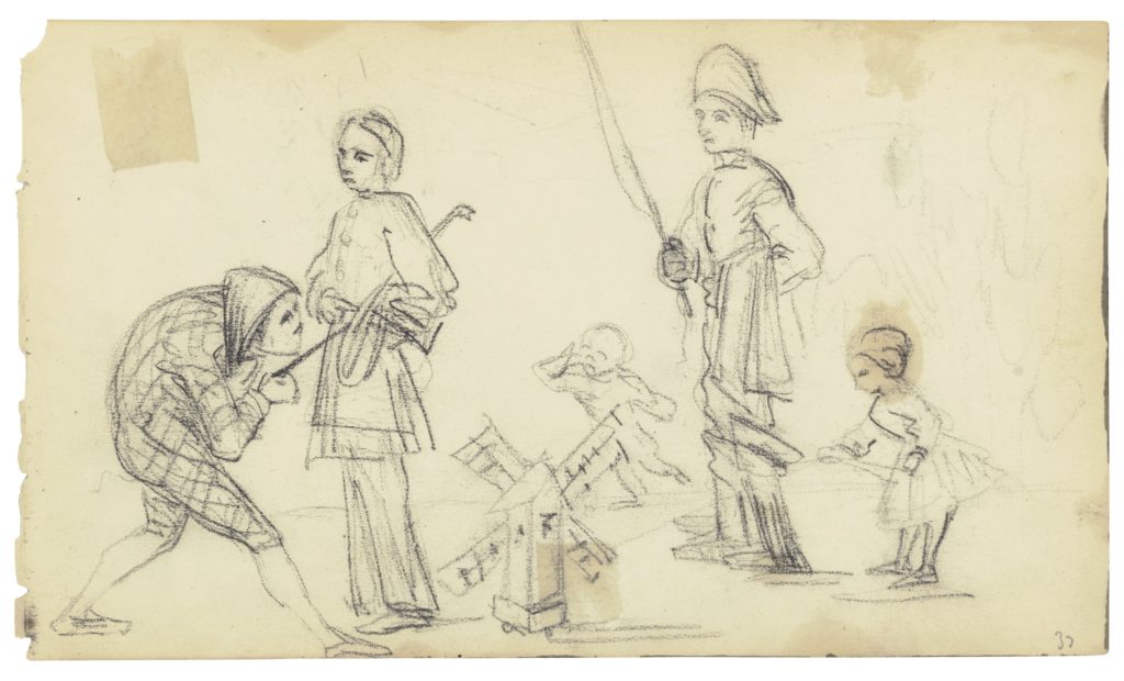 Mais surtout, au recto (si l’on imagine que le carnet a été paginé sur les rectos) on découvre un dessin fort intéressant représentant un groupe de 5 enfants jouant ensemble, l’un déguisé en arlequin, l’autre portant une mandoline, le troisième un fouet, autour d’un jouet représentant un moulin à vent. Une petite fille tient également quelque chose qui est peut-être une corde à sauter ou un yo-yo qu’elle fait tourner. Le traitement graphique du personnage au fouet, notamment le bas de son corps, nous incite à penser que ce dessin se situe aux alentours de 1865, et plutôt après, bien que l’ensemble des lignes de contours des personnages demeurent relativement simples, comme dans les dessins du début des années 1860.