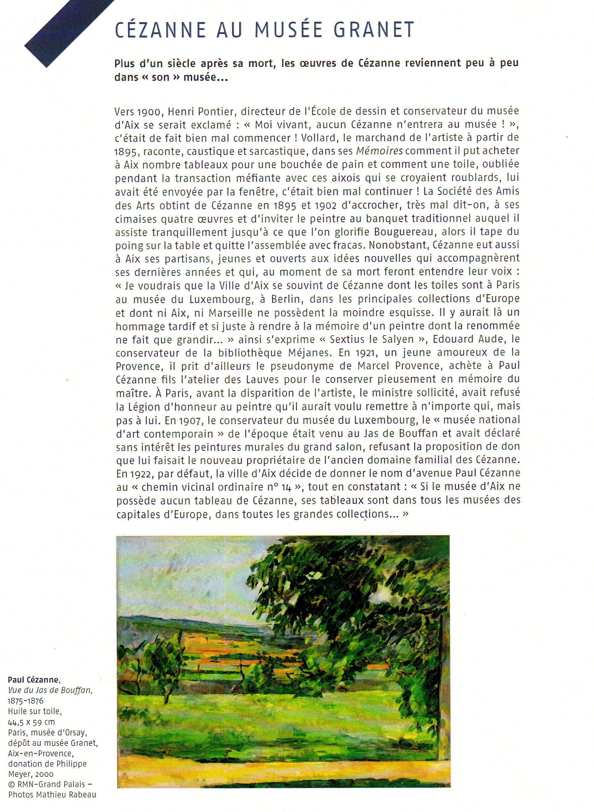 En effet, le propos de Bruno Ely, Conservateur en chef, Directeur du musée Granet et Commissaire de cette exposition, était de rassembler de manière synthétique toutes les œuvres et tous les documents dont le musée Granet est détenteur en rapport immédiat avec Cezanne. Certaines de ces œuvres sont arrivées au musée Granet via l’atelier Cezanne à qui elles ont été attribuées, ou via une mise en dépôt du musée d’Orsay, lorsqu’il s’agit d’œuvres appartenant à la collection « Philippe Meyer ».