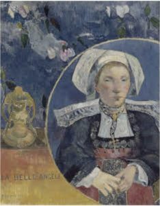 De même, dans le célèbre portrait de La Belle Angèle[61]Gauguin, La Belle Angèle (1889), Paris, musée d’Orsay. L’œuvre appartint à Degas, qui l’acquit à la vente que Gauguin organisa de ses tableaux le 23 février 1891., le fait de le détacher dans un grand médaillon et de lui ajouter à gauche une poterie assez inquiétante, inspirée de statuettes de la culture péruvienne mochica (hommage, sans doute, aux années de petite enfance que Gauguin passa au Pérou), change le sens de la simple représentation d’un visage de femme : lui donne à la fois l’aspect d’un objet précieux, à l’écart du monde vivant, et un caractère vaguement inquiétant, de nature littéraire, son regard entrant en résonance avec celui de la statuette.