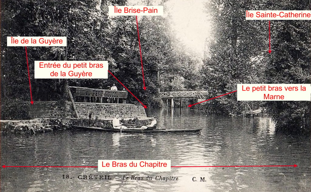 A Port-Créteil, on a vu Cezanne peignant la pointe de l’île Brise-Pain, celle-ci marquant la sortie du Bras du Chapitre. Passant à partir de là du côté de Créteil, Cezanne ne peut manquer d’aller explorer ce lieu à la réputation solidement établie comme but de promenade particulièrement dépaysant, qui charme par son aspect sauvage et bucolique.