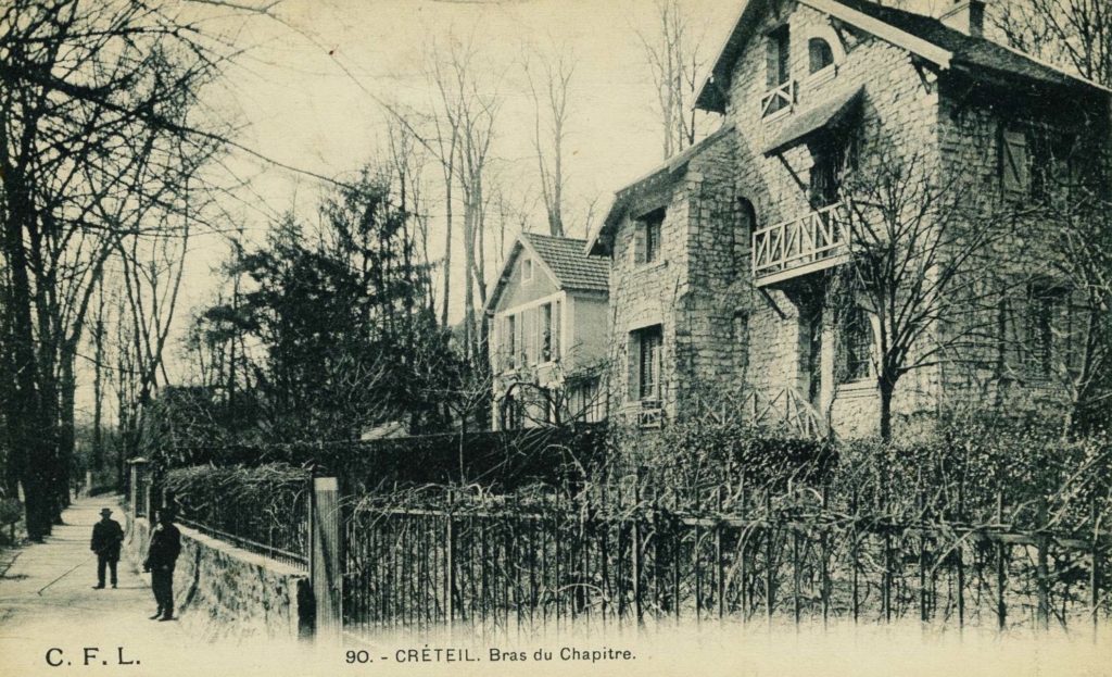 Le mur d’enceinte continue à longer la propriété du château du Buisson. Bordé de ces murs à gauche et à droite, le chemin s’éloigne pour un temps du Bras du Chapitre, alors inaccessible, jusqu’à la route qui nous ramène au pont de Créteil.