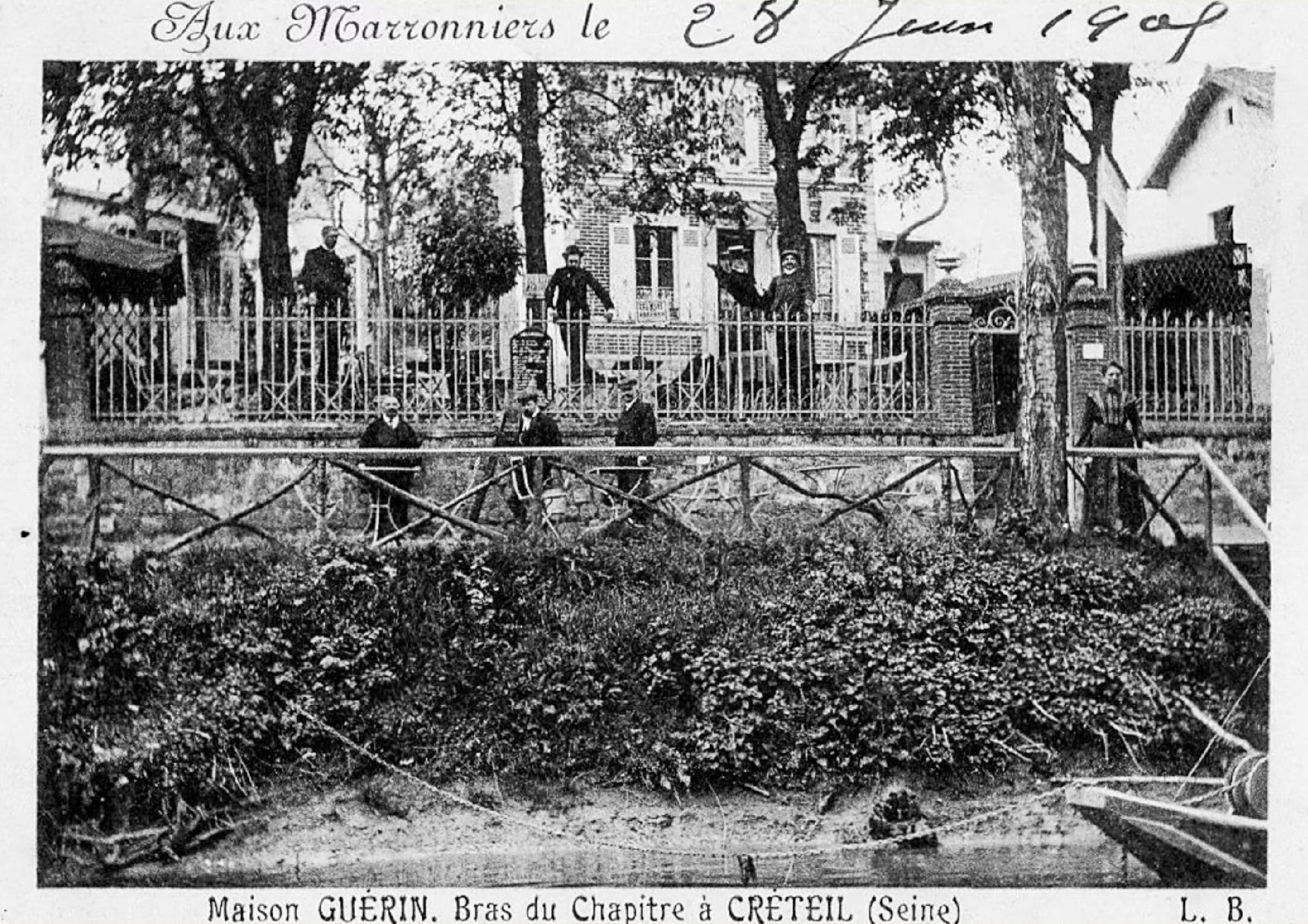 En traversant ce pont en direction de Bonneuil, on se retrouve à l’entrée du Bras du Chapitre entre les rives également verdoyantes de l’île des Peupliers et de l’Île Barbière. Contrairement au chemin resserré et courant le long d’un bras d’eau étroit que l’on vient de quitter, ici l’horizon s’ouvre largement sur la Marne, dans un contraste soudain qui libère un vaste espace. Aussi le lieu est-il particulièrement prisé des Parisiens du dimanche, d’autant qu’on y trouve le restaurant-guinguette peut-être le plus renommé de tout Créteil, l’Arche de Noël et son célèbre arbre penché, qui organise canotage, réjouissances nautiques, jeux et fêtes, et met à la disposition de qui le désire un passeur pour explorer les rives des îles, dans un cadre privilégié (point i).