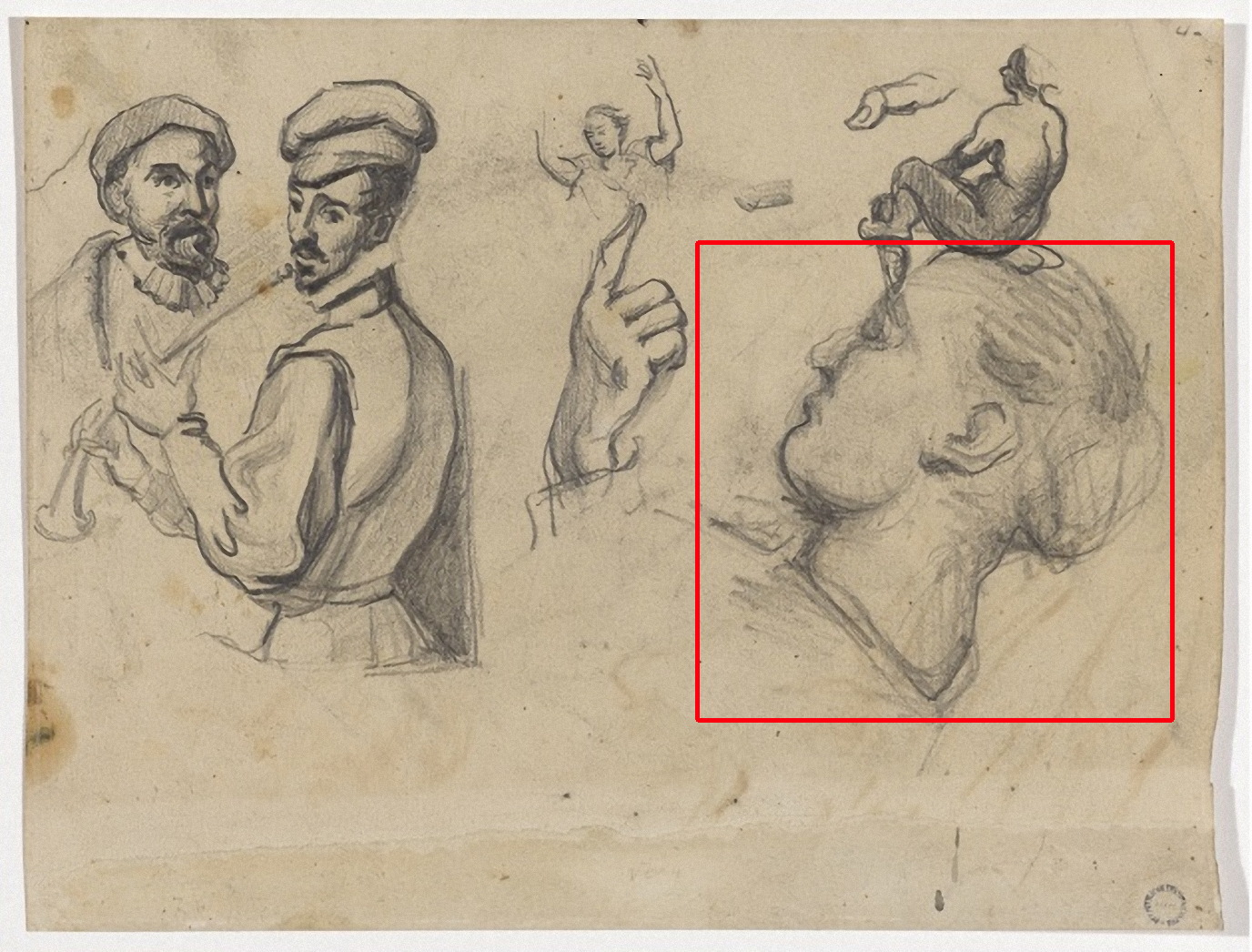 | ↑74 | - Delacroix, Study of a Left Arm and Hand, Accession Number 2001.524.3, MET NY. – Cezanne, Page d’études, 1864-67, FWN 3017-06a — C0117c. – cf. aussi Delacroix, étude pour La Chasse au lion (détail), Bayonne, Musée Bonnat-Helieu. Noter que le Louvre n’achètera l’autre version peinte du tableau qu’en 1902 (RF1392) et une feuille de dessin de Delacroix sur le même thème qu’en 1907 à la vente Robaut (RF 3704 et 3705) : Cezanne n’a pu les voir. |