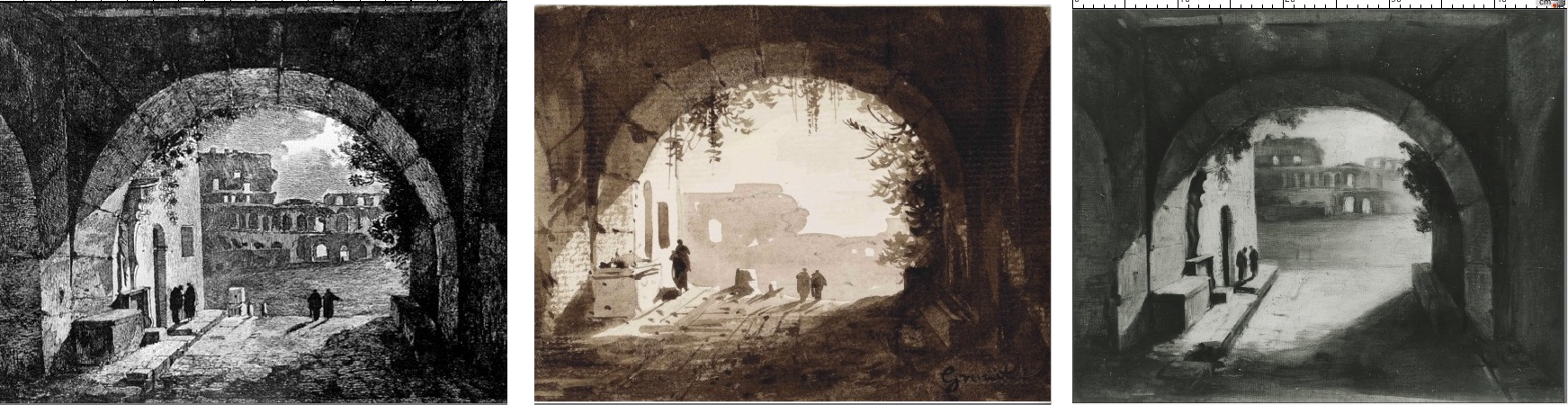 Fig. 22 à 24 — Gravure de Marius Reynaud, lavis de « Granet » et copie de Cezanne[23]- Marius Reynaud, Intérieur du Colisée, 1813, gravure d’après un dessin de Granet. Quatre exemplaires connus : deux au musée Arbaud et un au musée Granet à Aix, un au cabinet des estampes de la Bibliothèque Nationale.
