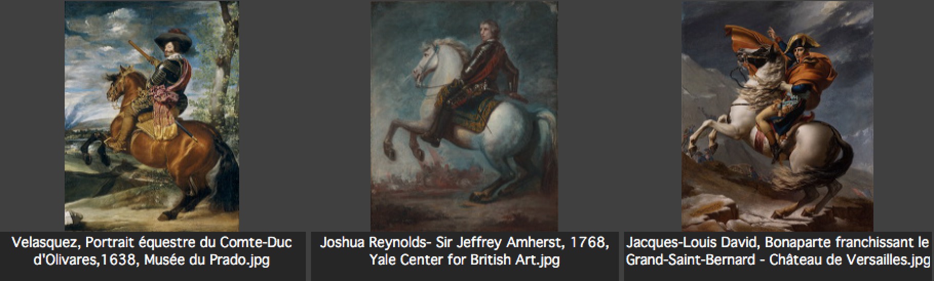 | ↑54 | - Anthony van Dyck, Un Cavalier, 1630, huile sur bois,25,7×22,5 cm, MET. – Alexandre-Gabriel Decamps, Cavaliers turcs (détail), 1839, huile sur toile, 32×38 cm, Musée Condé, Chantilly. – Chassériau, Bataille de cavaliers arabes autour d’un étendard (détail), 1854 54 x 64 cm Dallas Museum of Art. – Eugène Fromentin, La chasse au héron (détail), 1865, huile sur toile, Musée Condé, Chantilly. |