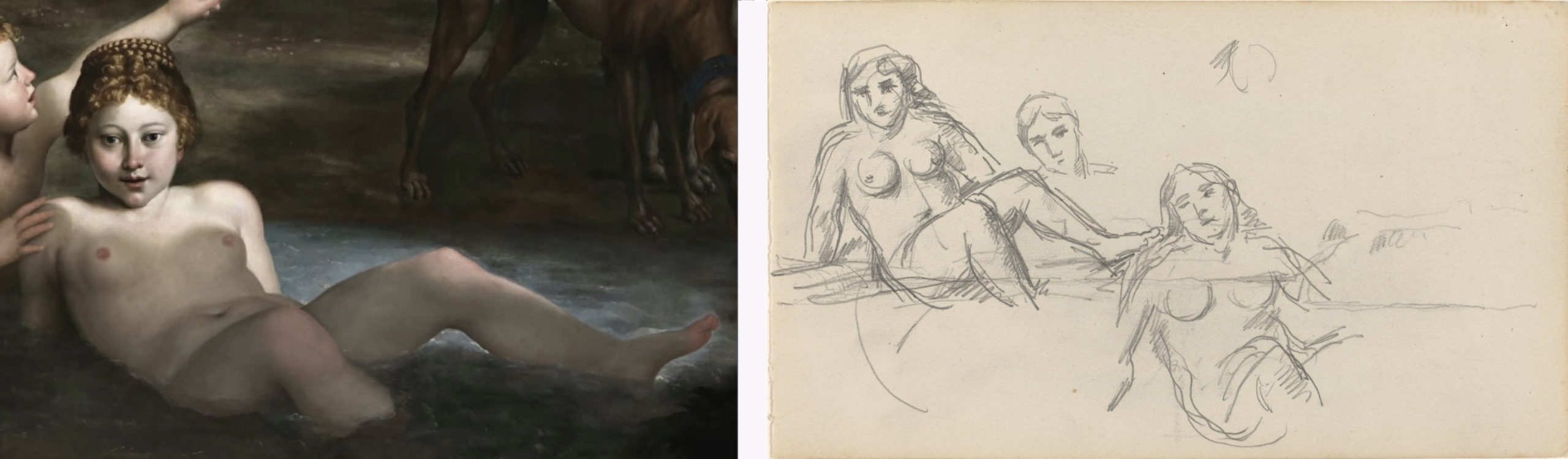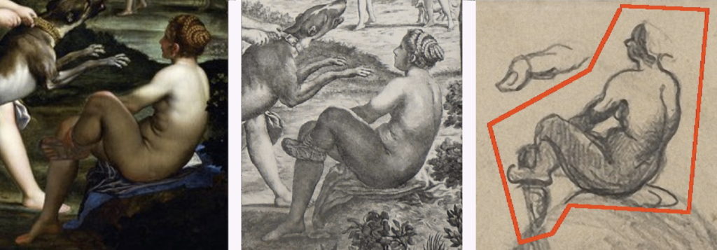 | ↑80 | On trouve deux variantes relativement proches en peinture quand il se représente lui-même dans Pastorale (FWN 609—R166) et, dans L’Enlèvement de 1867 (FWN 590-R121), la petite baigneuse de droite, qui fait écho à la baigneuse appuyée sur son coude FWN 3017-30b—C0199a (dans le même carnet de dessin que la copie de Sardanapale) ; mais toutes deux ont le tronc davantage redressé et en torsion plus accentuée, si bien que leur bras gauche leur sert également d’appui sur le sol, ce qui les différencie nettement de la position de Sardanapale. Chappuis signale que L. Gowing, Th. Reff et W. V. Andersen on d’ailleurs fait le rapprochement entre cette dernière position et celle de la Nymphe dans Echo et Narcisse de Poussin. On peut enfin observer une autre variante avec le bras gauche appuyé le long du corps dans FWN 3007-38a—RW121. |