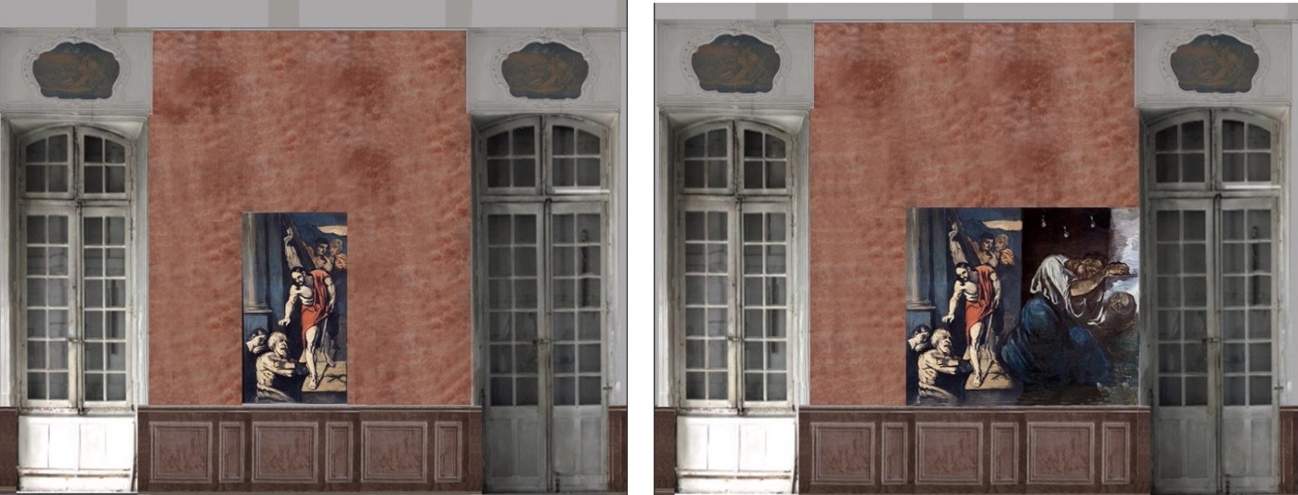 En revanche, on trouve entre 1862 et 1864 trois importantes copies peintes à partir de gravures. Il y a d’abord les deux amplifications de gravures permettant de décorer deux pans de murs du grand salon du Jas de Bouffan :