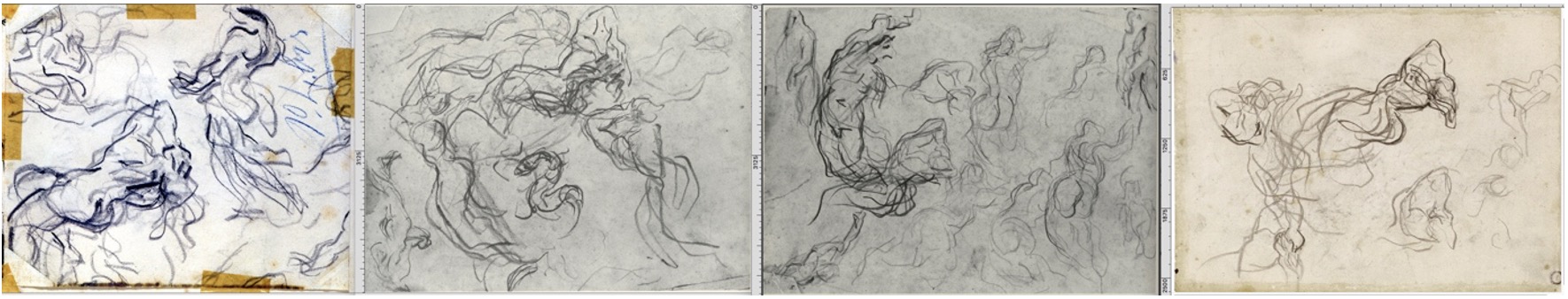 | ↑51 | - Paul Cezanne, Cavalier vu de dos, 1863-1865, dessins sur carnet, 10,3×17 cm, localisation inconnue (FWN 3001-01a-TA — C0089). – Léonard de Vinci, dessin préparatoire pour La Bataille d’Anghiari, 1503-1505 (©the Trustees of the British Museum). – Léonard de Vinci ou Giovanni Francesco Rustici, Tavola Doria, 1503-1505, copie de la scène centrale de « La Bataille d’Anghiari », La Lutte pour l’étendard, peinture sur panneau de peuplier, Les Offices, Florence. |